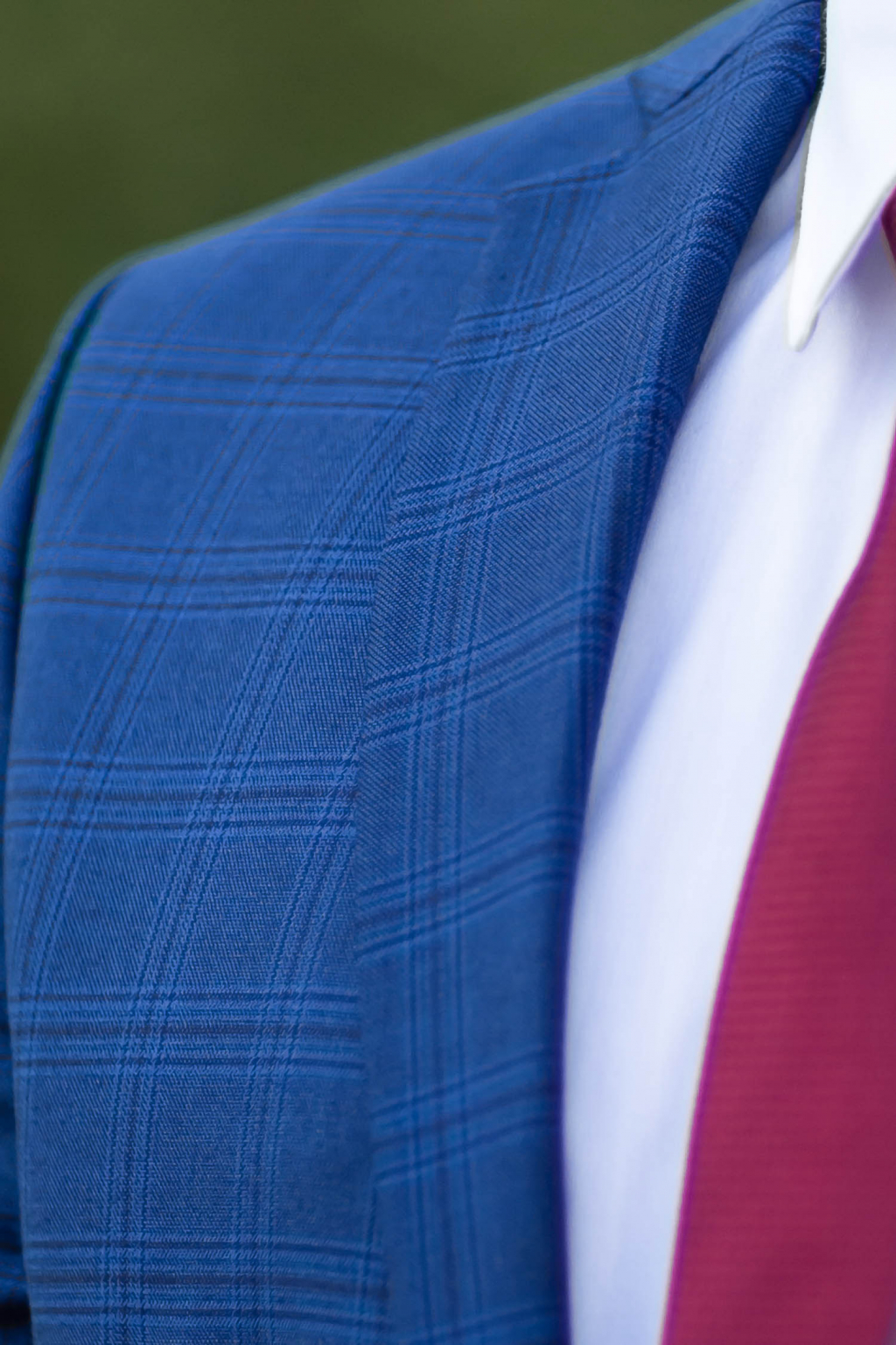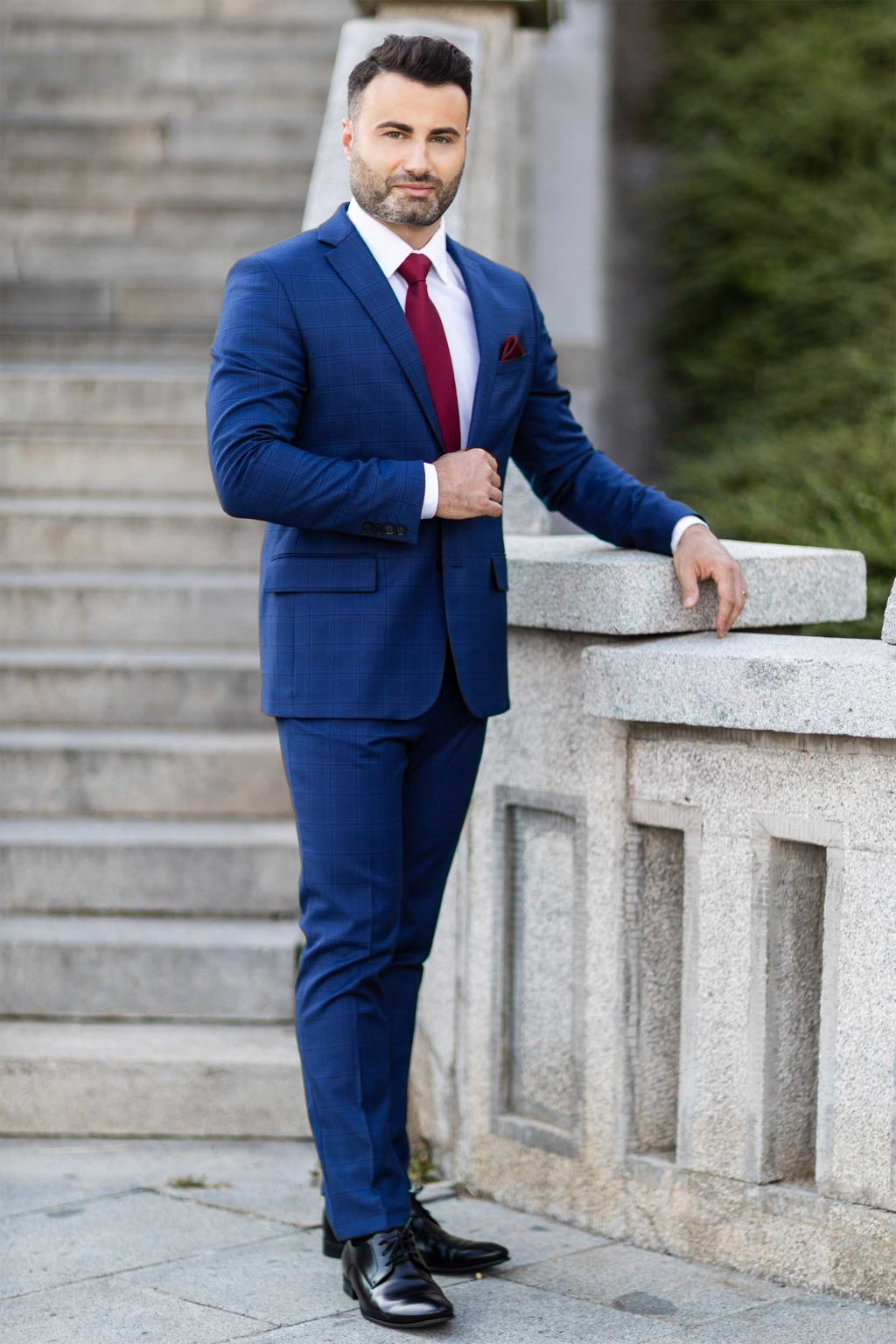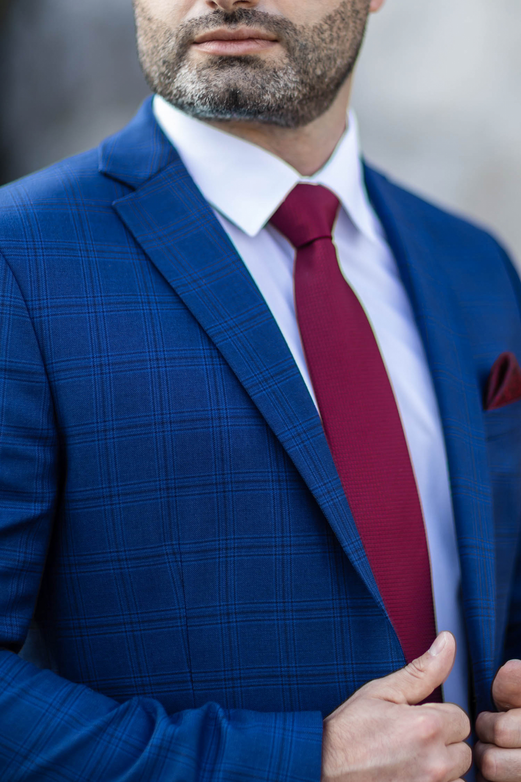 Károvaný oblek modrej farby SLIM STRIH, klasický
