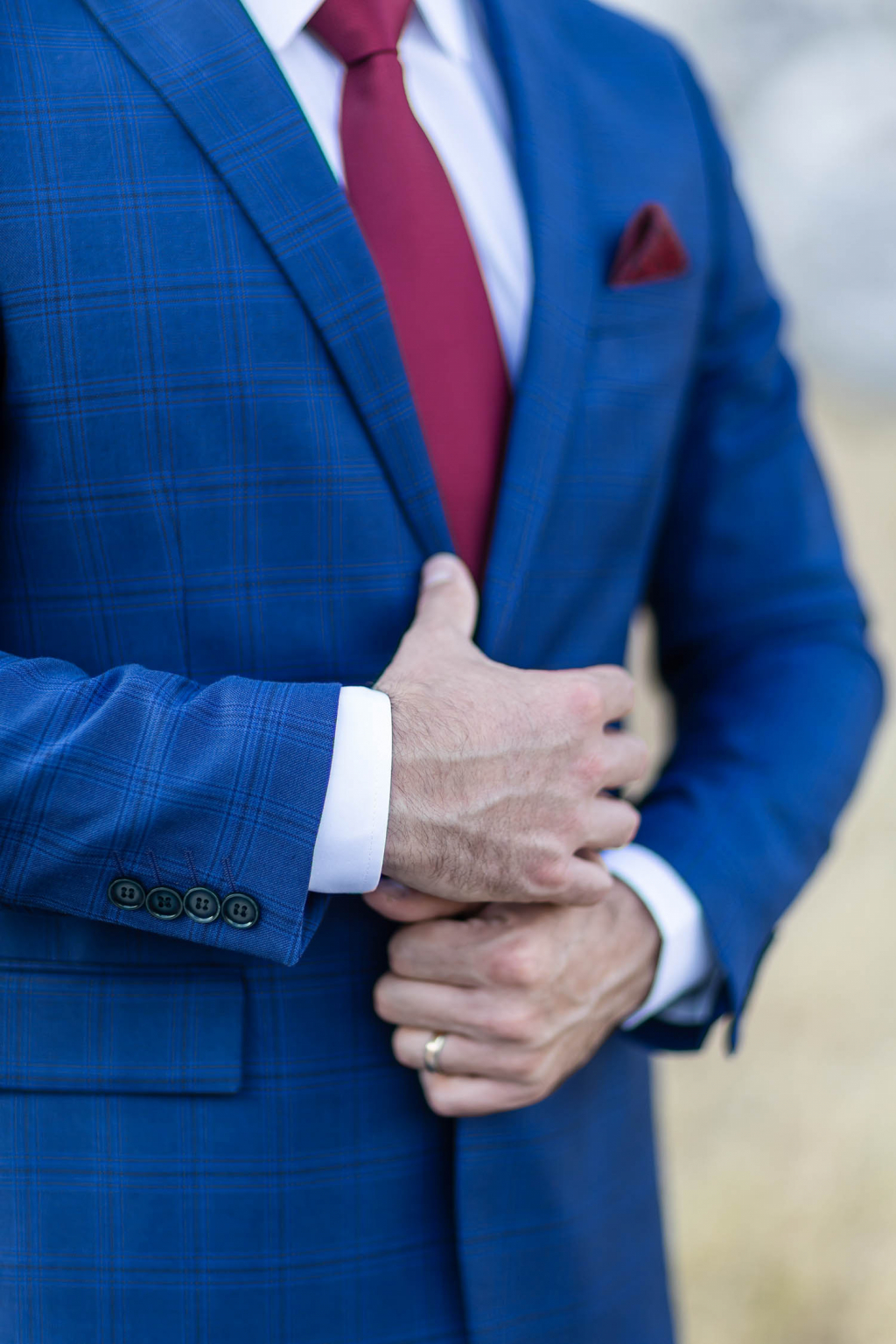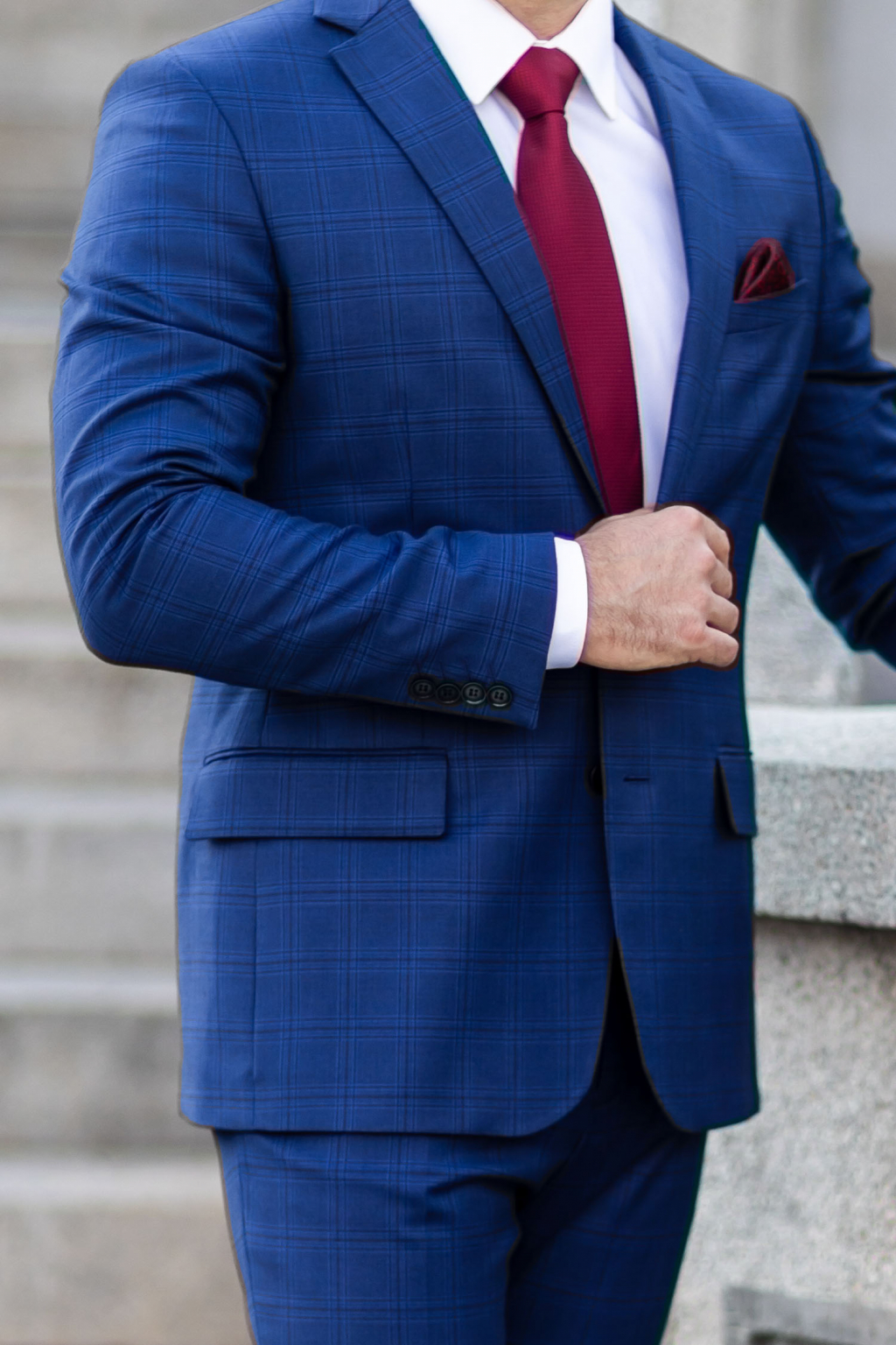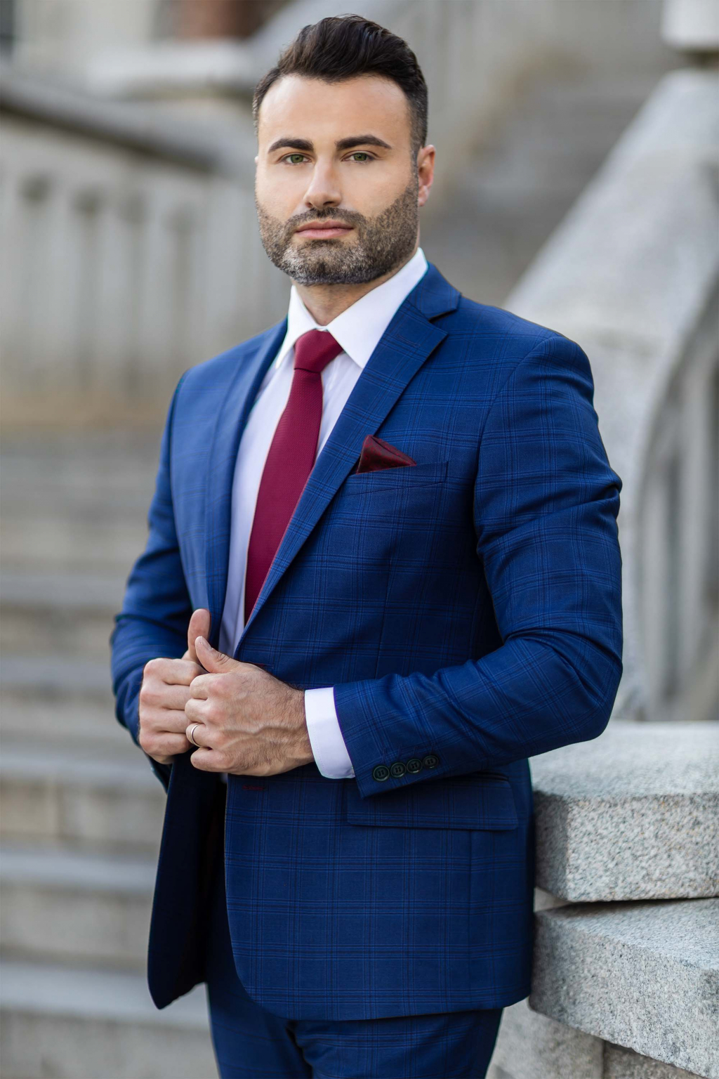 Károvaný oblek modrej farby SLIM STRIH, klasický